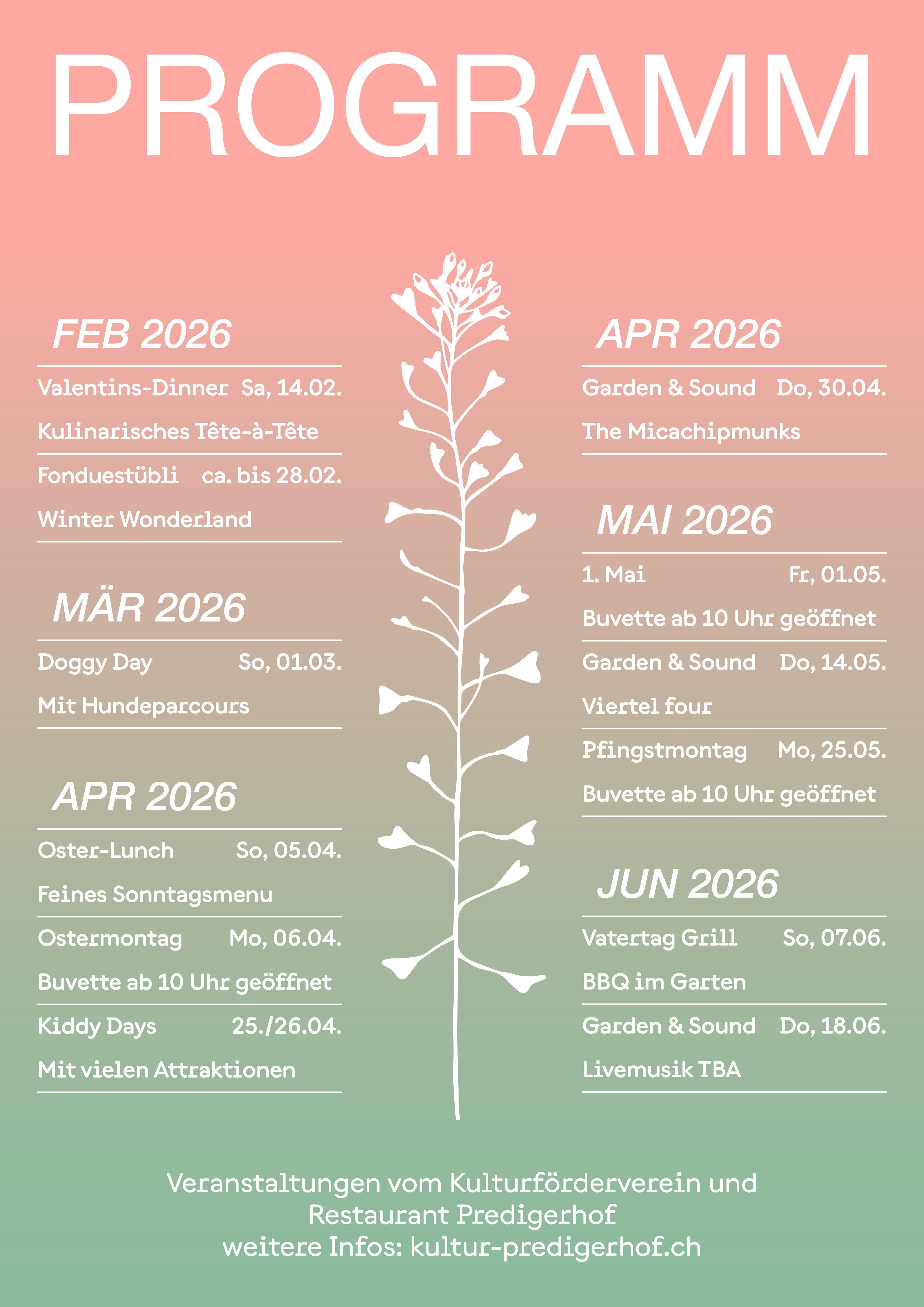 Das kulinarische Konzept vom Restaurant Predigerhof basiert auf wechselnden Mittags- und Abendmenüs im Restaurant sowie einem bodenständigen Angebot in der Buvette. Wir freuen uns, euch begrüssen zu dürfen.